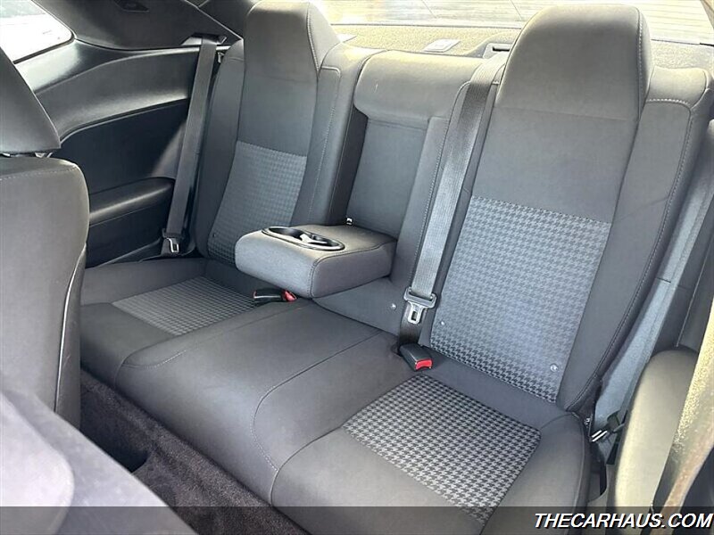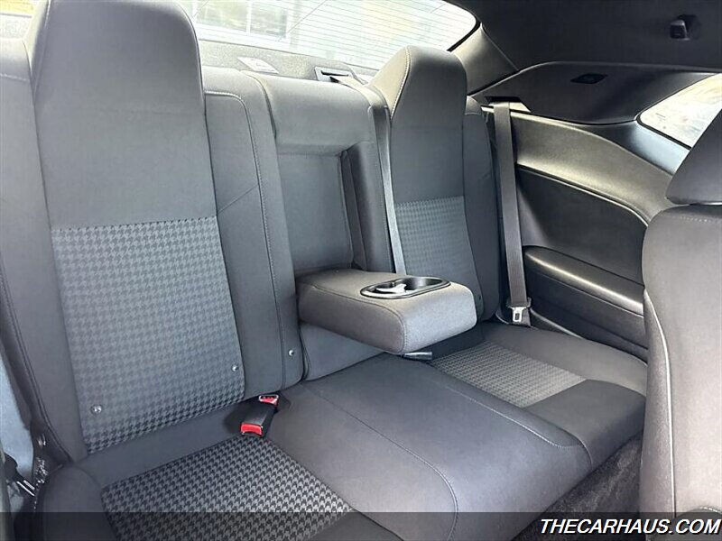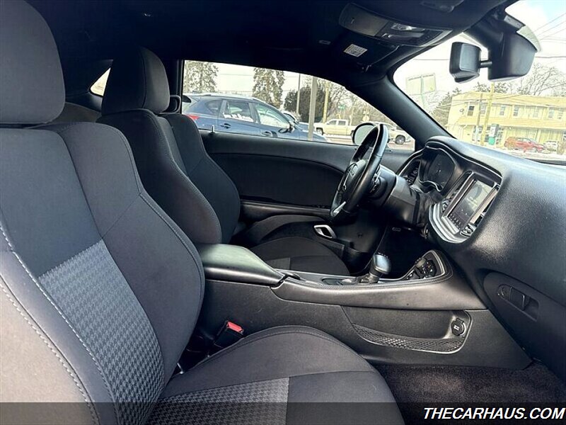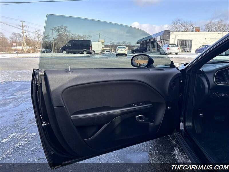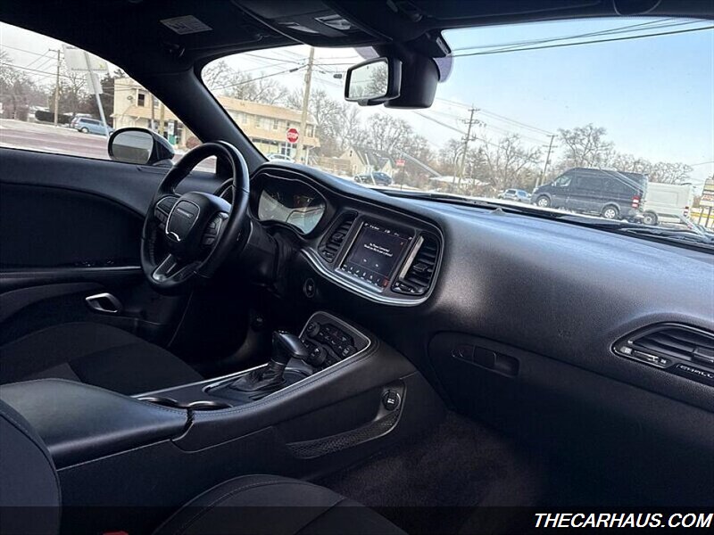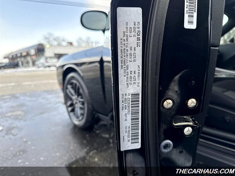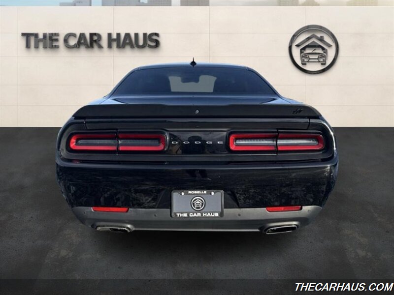 - Exterior: Pitch Black Clear Coat finish, 18-inch alloy wheels, dual exhaust outlets, and a muscular coupe profile with broad shoulders and classic Challenger styling cues.