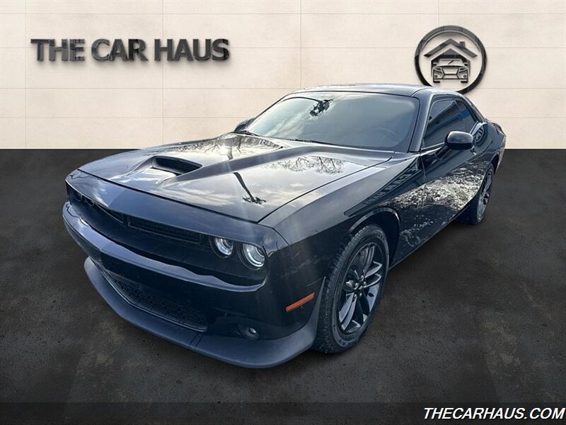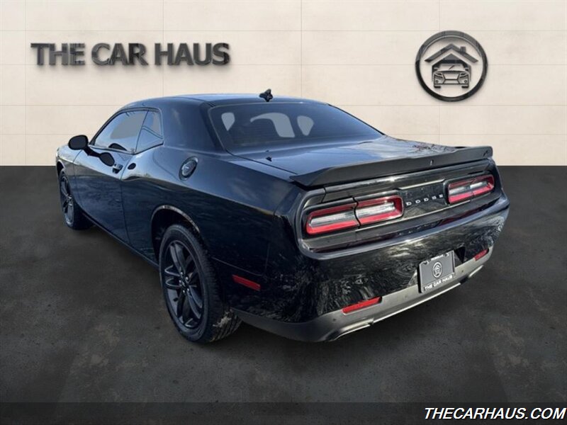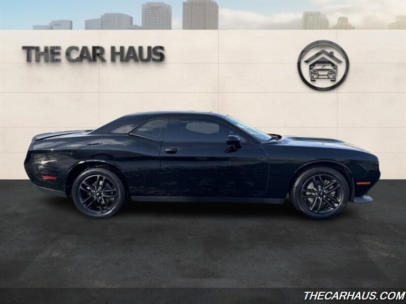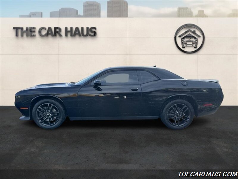 2019 Dodge Challenger GT — Pitch Black Clear Coat exterior, Black cloth interior. Powered by the Pentastar 3.6L V6 producing 305 hp and 268 lb-ft of torque, paired with an 8-speed automatic transmission and all-wheel drive. EPA fuel economy is approximately 18 MPG city and 27 MPG highway.