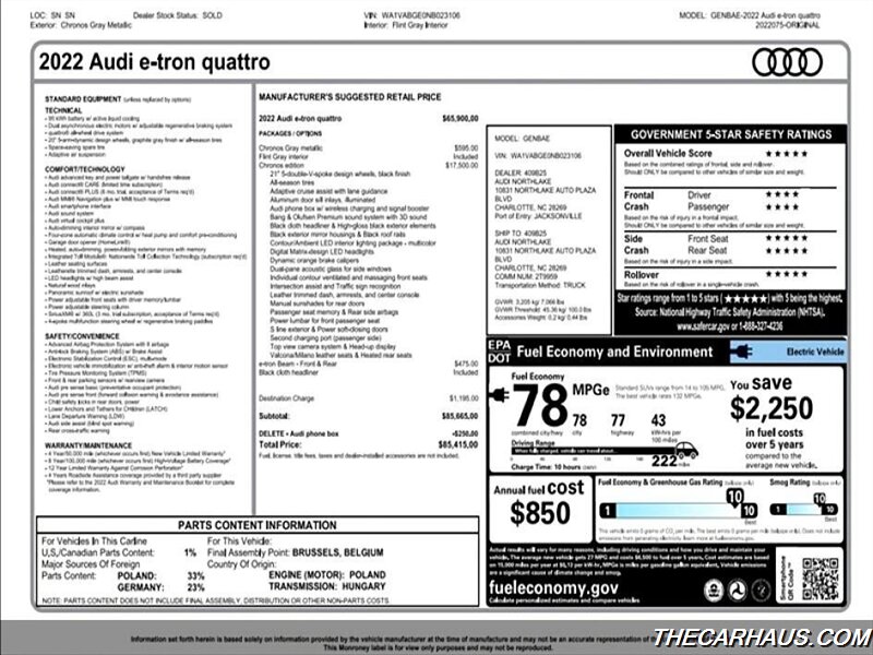 2022 Audi e-tron quattro Chronos — ruthless electric performance: 402 hp and 490 ft-lbs of instant torque, finished in Chronos Gray Metallic with Flint Gray leather and signature Orange Piping — excellent overall condition and ready to dominate. MSRP $85,415!