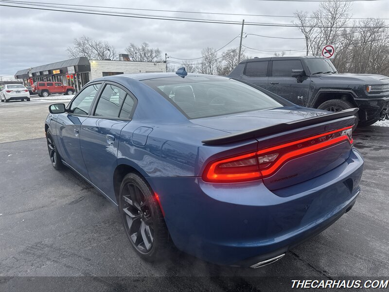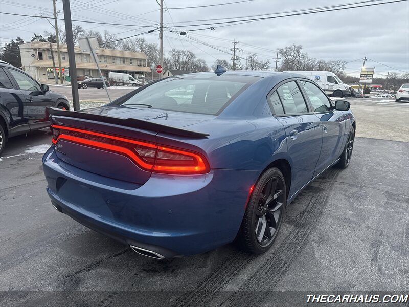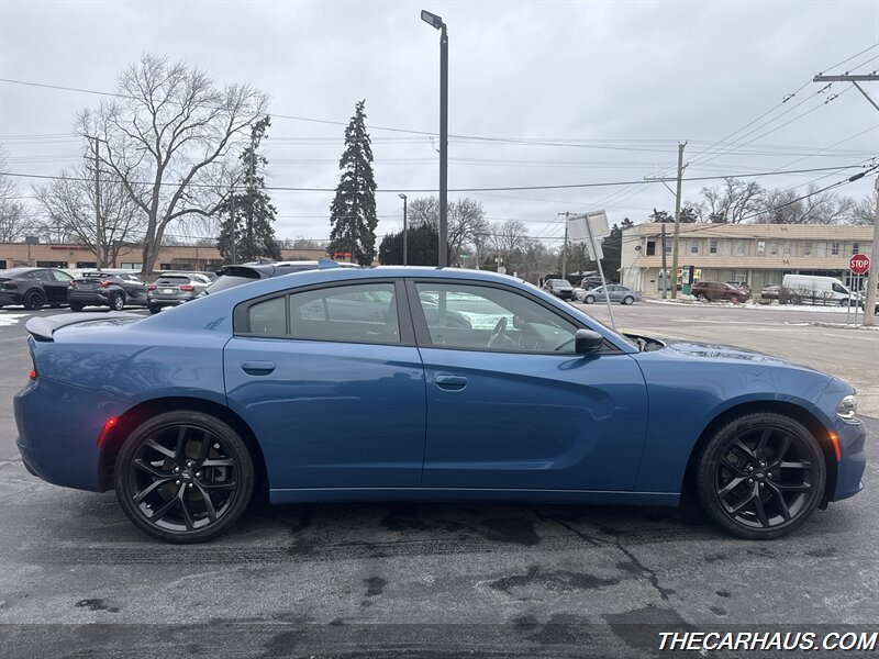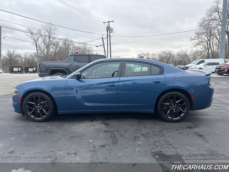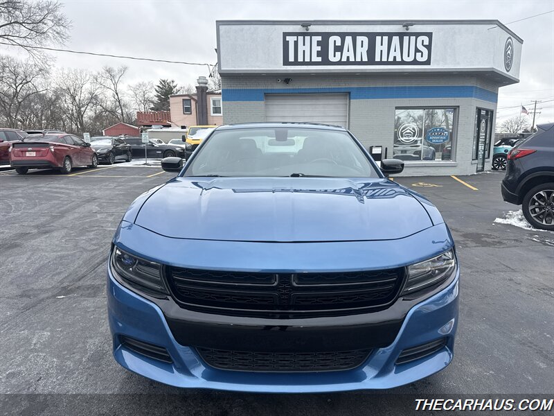 2023 Dodge Charger SXT — B5 Blue Pearl Coat exterior, Black cloth interior. This Charger is powered by the Pentastar 3.6L V6 producing 292 hp and 260 lb-ft of torque, paired with an 8-speed automatic transmission and rear-wheel drive. EPA fuel economy is rated at 19 MPG city and 30 MPG highway. The vehicle is in excellent overall condition and comes with a clean CARFAX report.